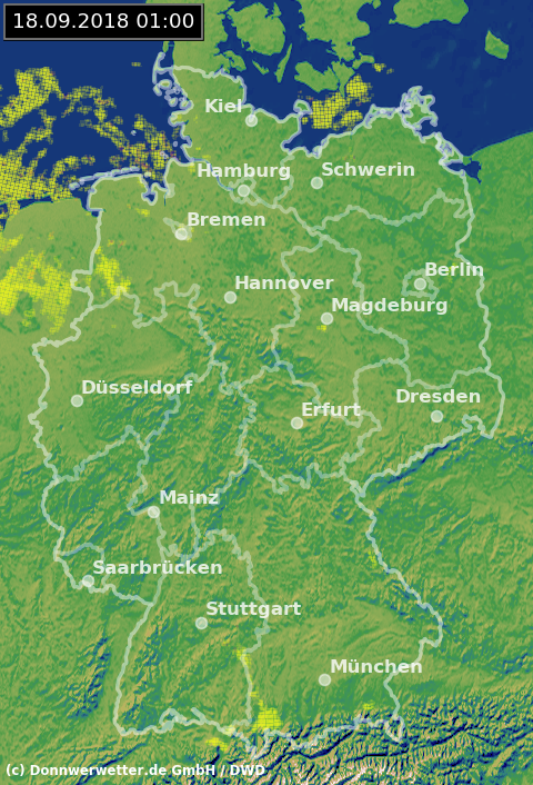 Das Radarbild zeigt aktuell zwar einzelne schwache Signale, diese deuten allerdings nicht auf Niederschlag. Der Himmel über Deutschland präsentiert sich häufig sternenklar oder nur leicht bewölkt. In Schleswig-Holstein haben einzelne Nebelfelder gebildet.