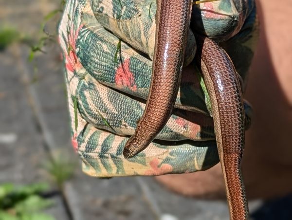 Was auf den ersten Blick aussah wie ein adipöser Regenwurm, entpuppte sich bei genauerm Hinsehen als Blindschleiche!