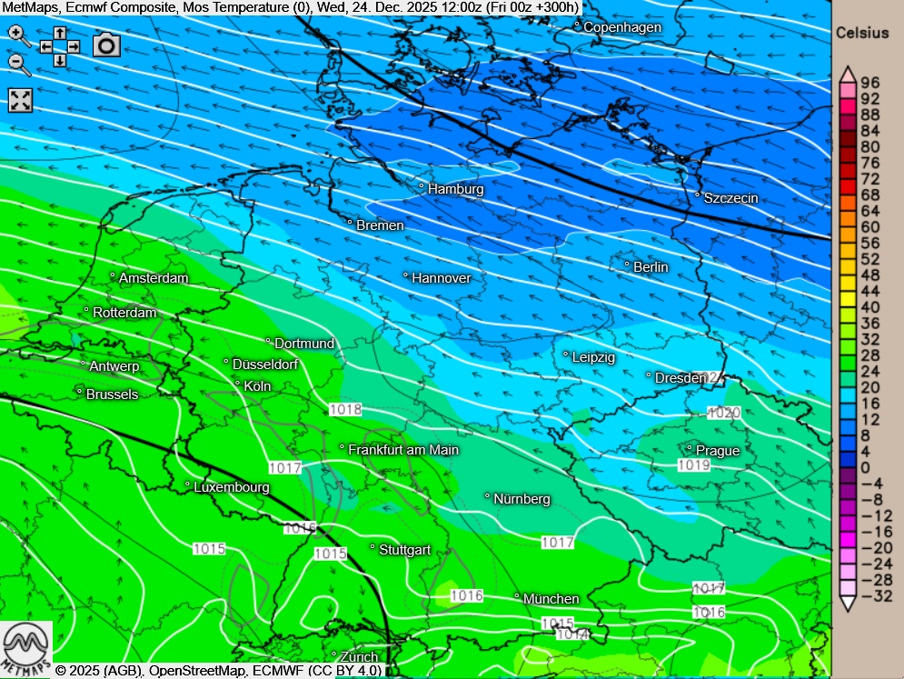Das europäische Modell bestätigt dieses Szenario zunächst und erwartet bis ein bis zwei Tage vor Heiligabend ebenfalls milde Verhältnisse.