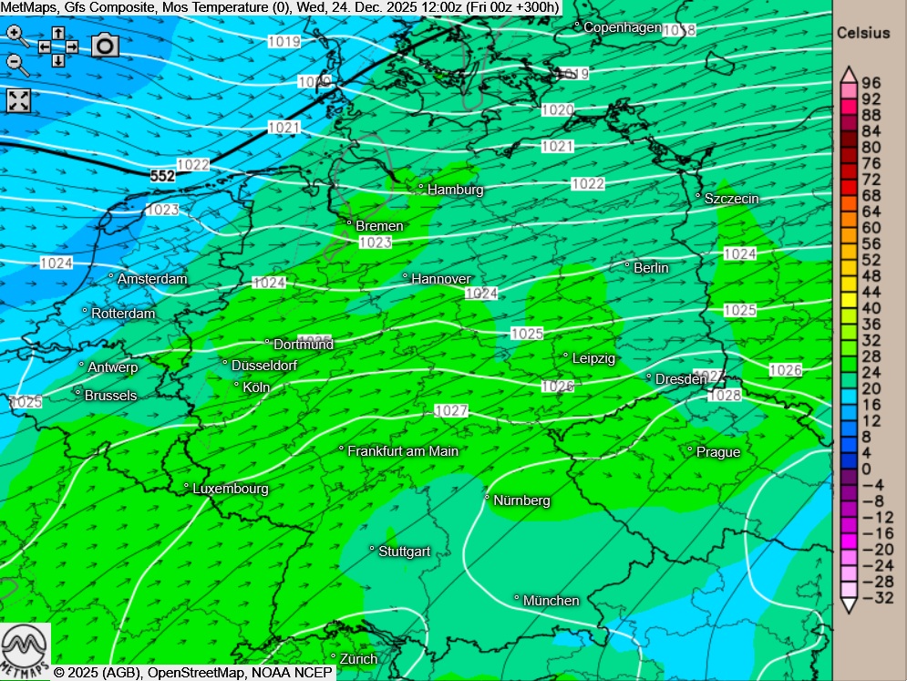 Das US-Modell GFS rechnet über die Feiertage hinweg mit einer insgesamt milden Witterung. Deutschland bliebe demnach in einer südwestlichen Strömung am Rande eines Hochdruckgebiets, was trotz einer leichten Abkühlung nur wenig Bewegung in die Wetterlage bringen würde. Insgesamt deutet sich aus dieser Perspektive eher ruhiges und unspektakuläres Wetter an.