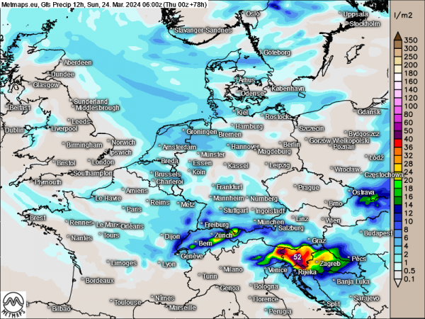 Große Regenmengen sind zwar nicht zu erwarten, ungemütlich und nass wird es mit Niederschlagssummen von 10 bis 15 l/m² am Samstag aber trotzdem. Dicker kommt es in Sachen Niederschlag etwa für Slowenien, Norditalien und Kroatien, wenn die Front auf Küstengebirge und feuchte Mittelmeerluft trifft - gut zu erkennen im folgenden Kartenausschnitt: