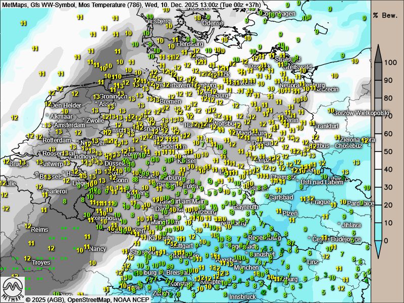 Mit einem für die Jahreszeit außergewöhnlich milden Start beginnt dieser Dezembertag in weiten Teilen Mitteleuropas. Bereits am Morgen werden in der Mitte Deutschlands sowie an den Küsten Temperaturen zwischen 10 und 13 Grad gemessen.