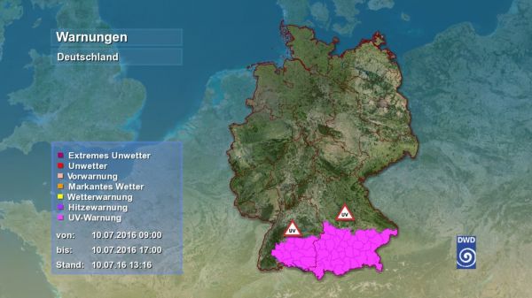 Aktuell liegt von Seiten des Deutschen Wetterdienstes nur eine Warnung vor erhöhter UV-Belastung in Teilen Süddeutschlands vor, doch es erscheint durchaus wahrscheinlich, dass sich diese Lage in den kommenden Stunden noch verändern wird.