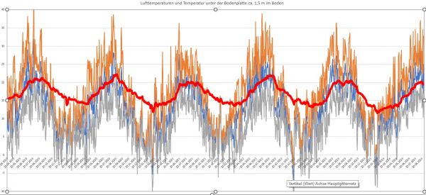 Temperaturen in 150 cm Tiefe - Temperaturen unterhalb der Bodenplatte und Lufttemperaturen im direkten Vergleich.