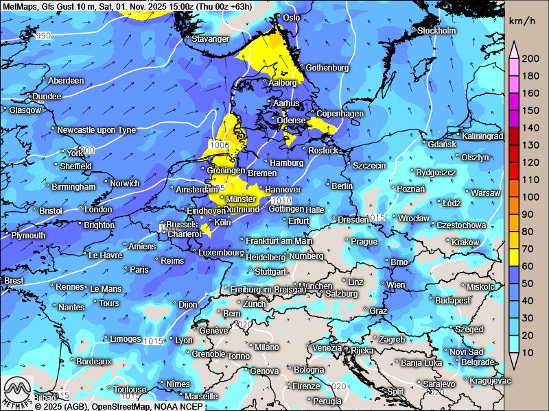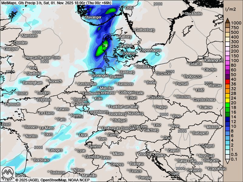 Die Böenkarten für Donnerstagmittag und Samstagnachmittag sowie die 3-Stunden-Regenmengen bis Samstagabend (18:00 Uhr) nach GFS: