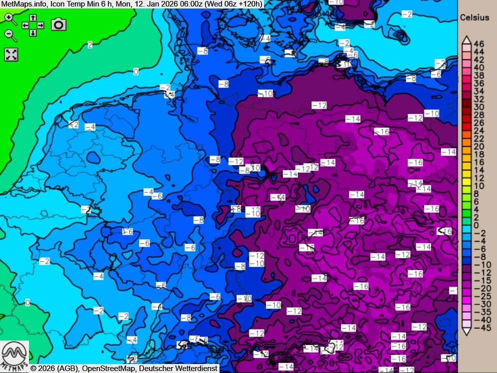 Die dritte Karte zeigt die Sechs-Stunden-Temperaturminima am Montagmorgen.
