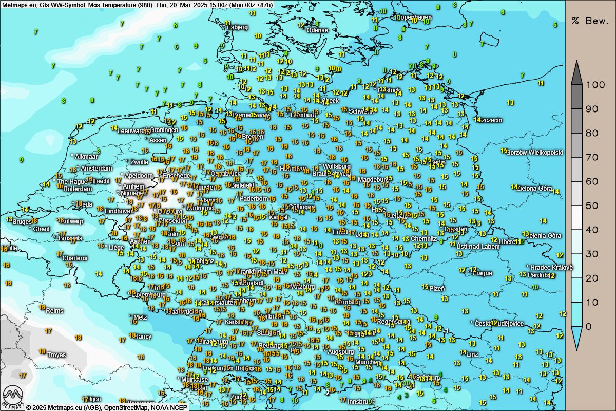 Ab Donnerstag erreichen die Temperaturen im Westen Deutschlands Werte um 20 Grad im Westen, Berlin und Hamburg kommen immerhin auf 15 bis 17 Grad.