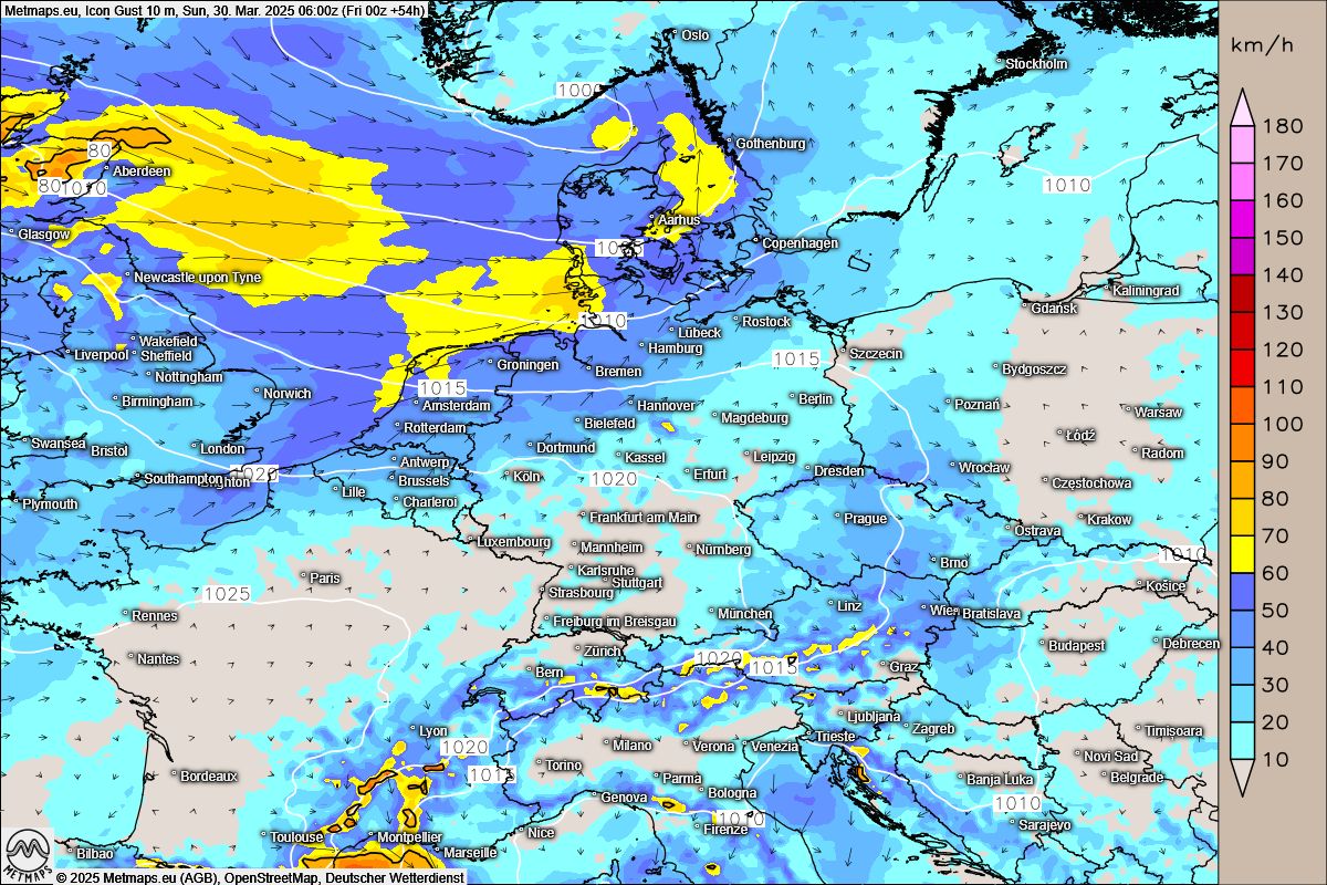 Wie in der Icon-Modellkarte zu sehen ist, sind im Küstenumfeld auch einzelne Sturmböen zu erwarten.