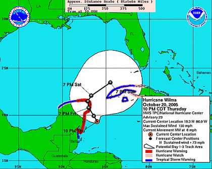 Der Hurrikan 'Wilma', der schon jetzt als der stärkste Hurrikan aller Zeiten in die Geschichte eingegangen ist, hat sich nach einer leichten Abschwächung am Donnerstag wieder etwas verstärkt. 'Wilma' wird zur Zeit als Hurrikan der Kategorie 4 eingestuft, könnte aber in den nächsten Stunden wieder auf die Kategorie 5 hochgesetzt werden. Am Rand des Auges wurden Windgeschwindigkeiten um 240 Stundenkilometer gemessen, in Böen sogar knapp 300 km/h.