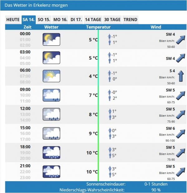 Neben ergiebigeren Niederschlägen, zwischen Samstagmittag und Sonntagfrüh können im Gebiet 10 bis 20 l/m² Regen fallen, stellt vor allem der Wind eine Gefahr für Aktivisten und Einsatzkräfte dar: Am Samstag drohen schwere Sturmböen bis 90 km/h (Windstärke 10) - vor allem in den hochgelegenen Baumhäusern besteht für alle Beteiligten aktute Lebensgefahr.