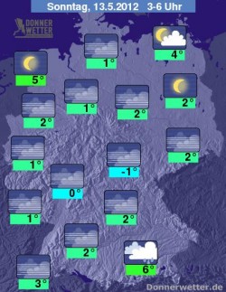 In der Nacht zum Sonntag kann es bei aufklarendem Himmel stark abkühlen. Die Lufttemperaturen sinken an den Gefrierpunkt, es kann Bodenfrost geben. Die Eisheiligen machen ihrem Namen also alle Ehre!