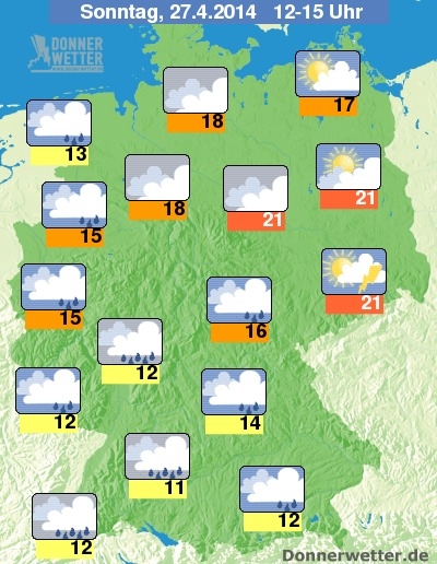 Am Samstag (siehe Karte oben) lacht die Sonne in weiten Teilen Deutschlands mit seltenen Schauern und Gewittern. Bis zu 22 Grad C werden nochmals erreicht.