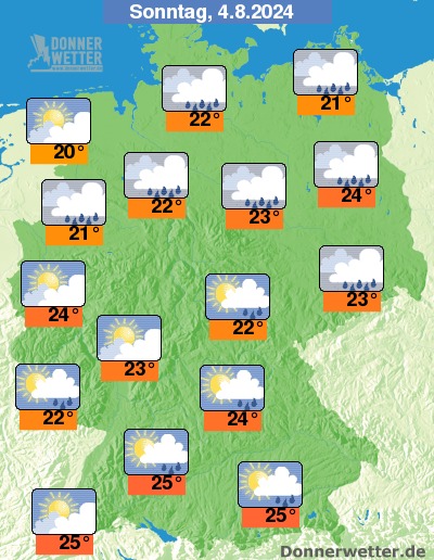 Im Süden und Westen fallen die Niederschlagsmengen geringer aus, lokal kann man hier sogar mit etwas Glück komplett trocken durch den Tag kommen. Einen kleinen Dämpfer gibt es auch für die Temperaturen: Die Höchstwerte pendeln sich am Sonntag auf 20 Grad in Küstennähe und 25 Grad südlich der Donau ein.