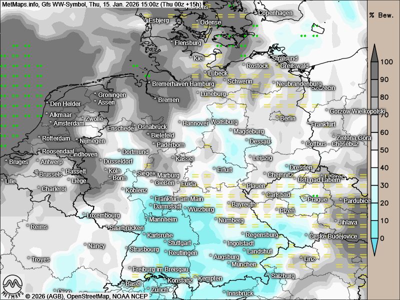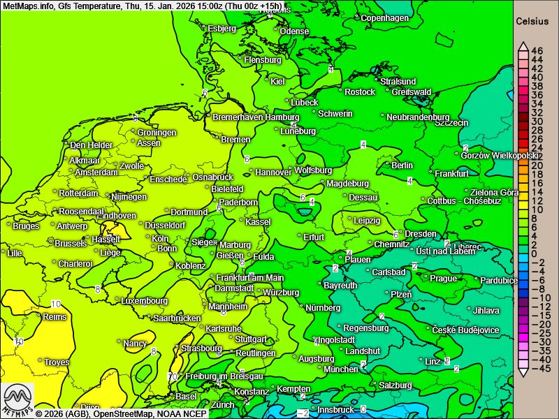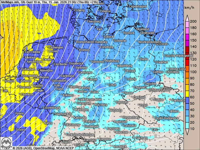 Die Böenkarte für Donnerstagabend (21:00 Uhr) sowie dieTemperatur- und Wetterkarte für Donnerstagnachmittag (15:00 Uhr) nach GFS: