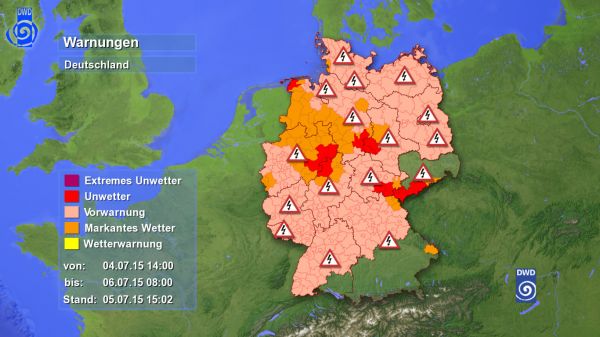 Abends und nachts treten weitere Schauer und Gewitter auf. Erst am Montag beruhigt sich die Wetterlage. Dienstag kommen dann wieder Gewitter. Hier die aktuelle Warnlage für den Sonntagabend: