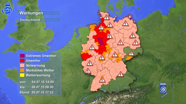 Bis 20 Uhr sind Niedersachsen, Hamburg und SH durch schwere Gewitter bedroht. Auch in Nordhessen und Sachsen-Anhalt können Gewitter aufziehen. Weiterhin kommt es in NRW, RP, Thüringen und Sachsen und auch später in BW und Bayern (Franken) zu Gewittern mit Unwettergefahr.