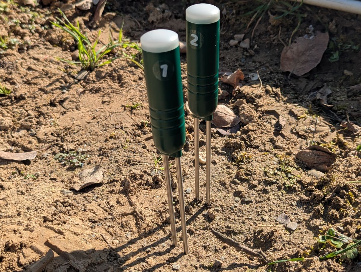 Um die Validität der Daten zwischen den Sensoren untereinander, aber auch im Vergleich zu unseren anderen Bodenfeuchtemessgeräten, zu ermitteln, wurden beide Sensoren im Außenbereich direkt nebeneinander in etwa 10 cm Bodentiefe versenkt.